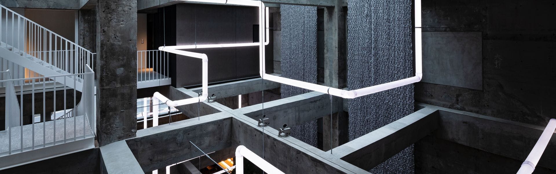 一歩足を踏み入れると、4階層分を大胆に打ち抜いた吹き抜けが広がります。そこに張り巡らされたのは、アーティスト、レアンドロ・エルリッヒによる作品《ライティング・パイプ》。 夜になるとパイプが光を放ち、まるで建物全体が呼吸しているかのような幻想的な空間に包まれます。この景色を見るだけでも、ここに来る価値があります。